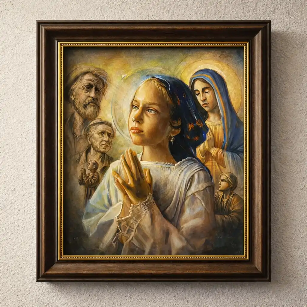 „Fir de lumină către cer” surprinde momentul interior al rugăciunii – clipa în care tăcerea devine lumină. Chipul copilului este modelat de o lumină caldă, iar prezențele din fundal sugerează continuitatea spirituală dintre generații.