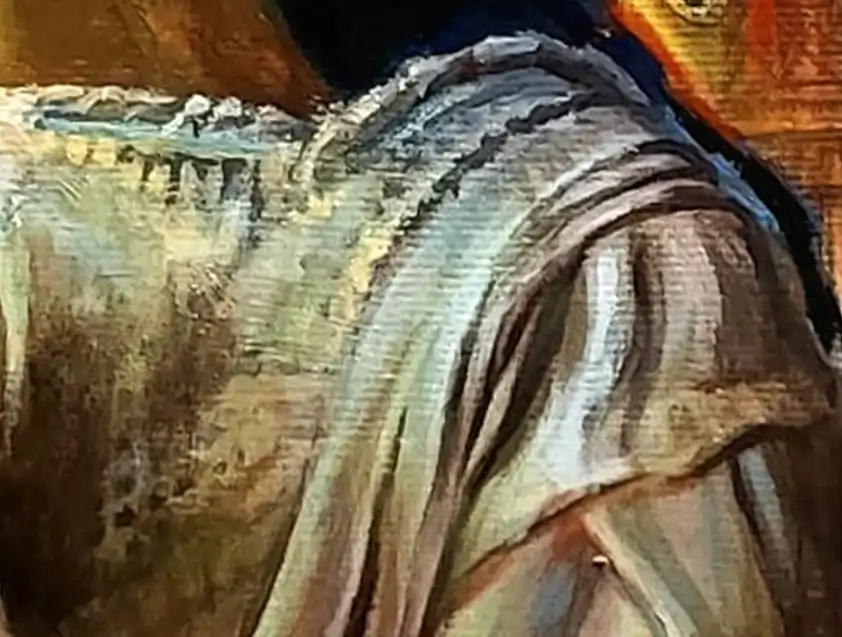 Materia picturală este construită prin straturi dense de culoare, iar lumina modelează volumele și creează o vibrație subtilă în interiorul imaginii. În această pictură contemporană, figura nu este tratată ca simplă reprezentare, ci ca prezență simbolică într-un spațiu interior.